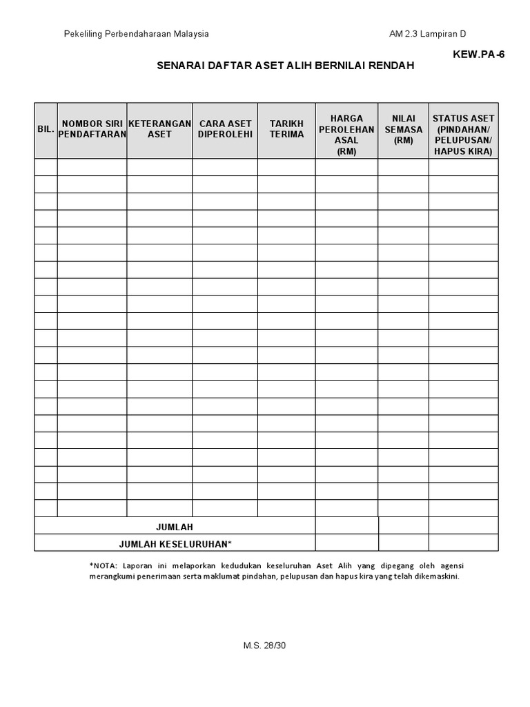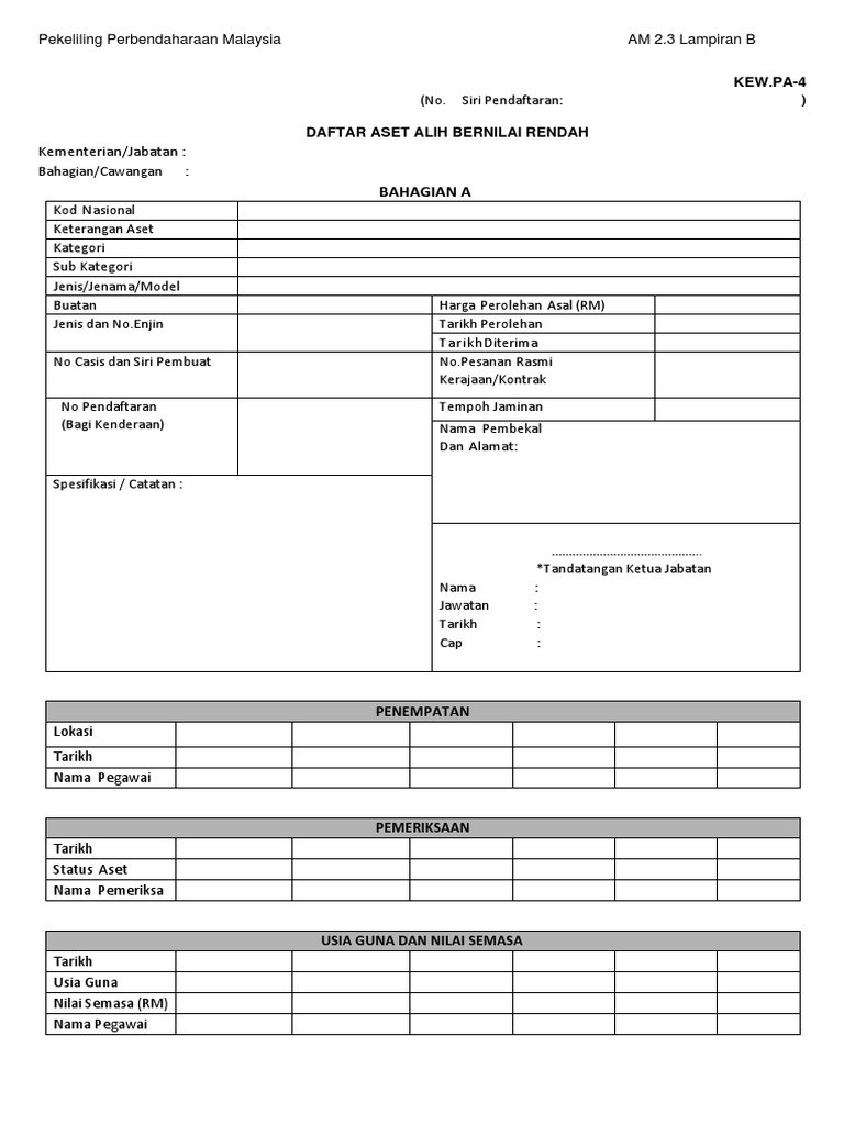 Hadiah daripada syarikat abc bertarikh 20 jun 2013. Aset yang sangat menarik atau bernilai tinggi akan terdedah kepada risiko kehilangan, maka hendaklah sentiasa di bawah kawalan. Tidak dapat dipungkiri bahwa mayoritas kekayaan alam indonesia dikuasai oleh asing. Kew pa 4 docx pekeliling perbendaharaan malaysia am 2 3 lampiran b no siri pendaftaran kew pa 4 daftar aset alih bernilai rendah kementerian jabatan course hero. Laporan pelupusan aset alih kerajaan.